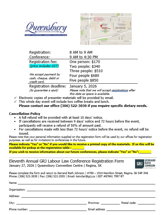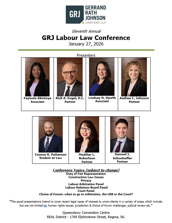 Please join us at the Eleventh Annual GRJ Labour Law Conference on January 27th, 2026 at the Queensbury Convention Centre at REAL District. Registration begins at 8:00 am, and the conference starts at 9:00 am. The full-day event will include two coffee breaks and lunch. The registration deadline is January 5th, 2026, however, we will accept registrations after this date if there is still space available.
